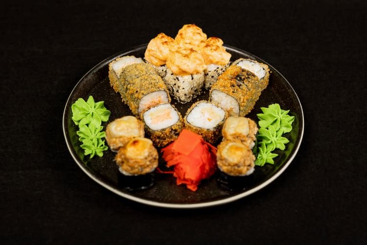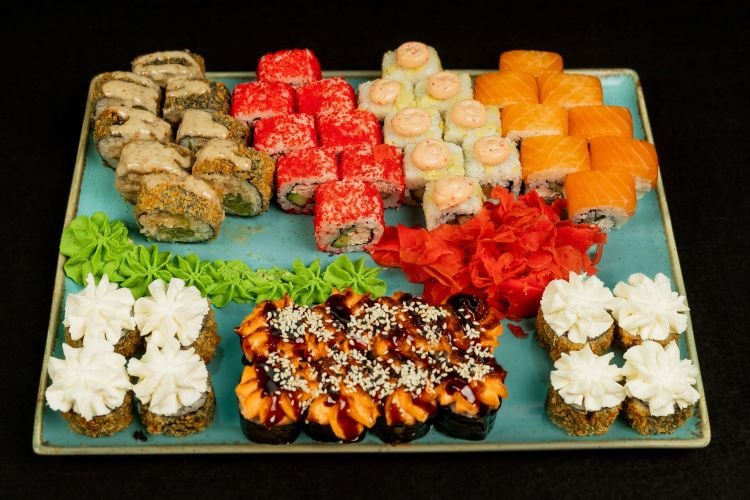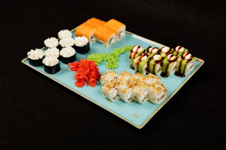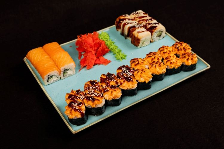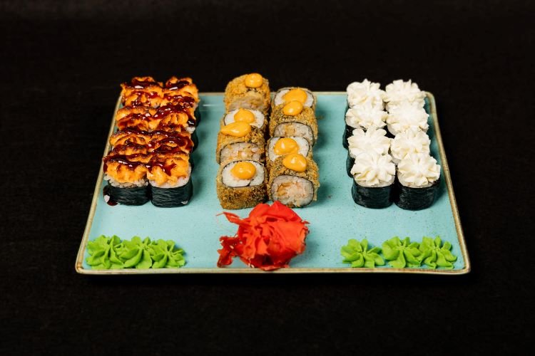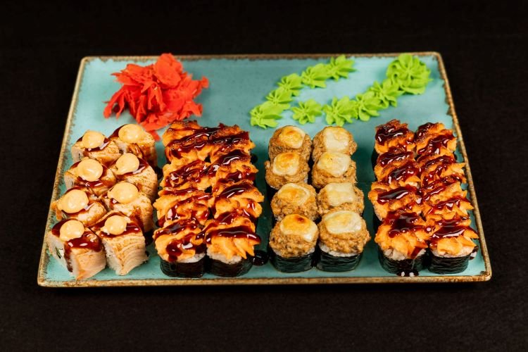 Филадельфия лайт, спайси с курицей, мини ролл с угрем, дакота, хоккайдо