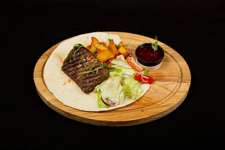 Оленья вырезка подается с картофелем "Айдахо", свежими овощами и клюквенно - брусничным соусом.